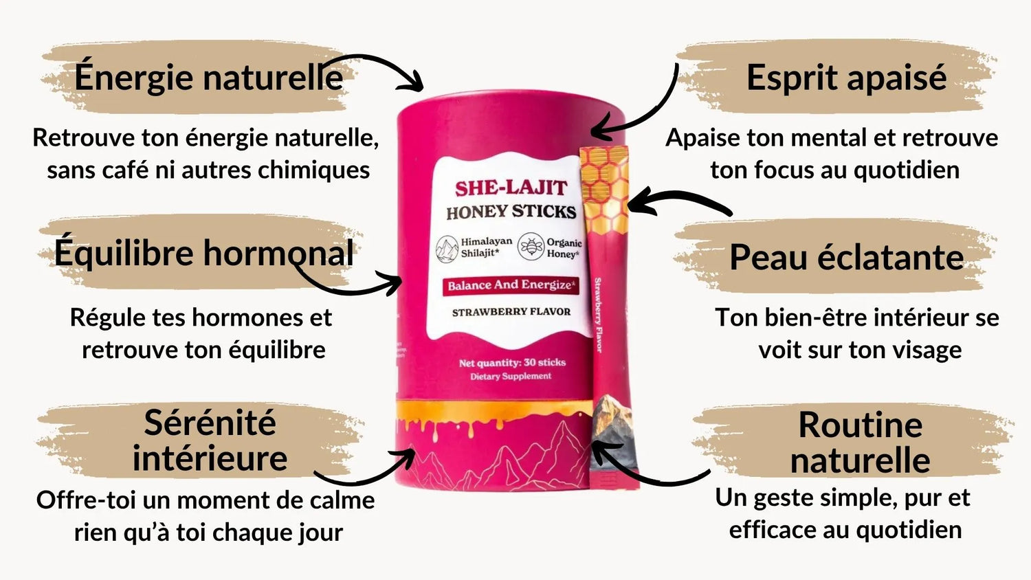 She-lajit aide à rééquilibrer les hormones, favoriser une ovulation saine, et améliorer l’humeur ainsi que l’énergie au quotidien.